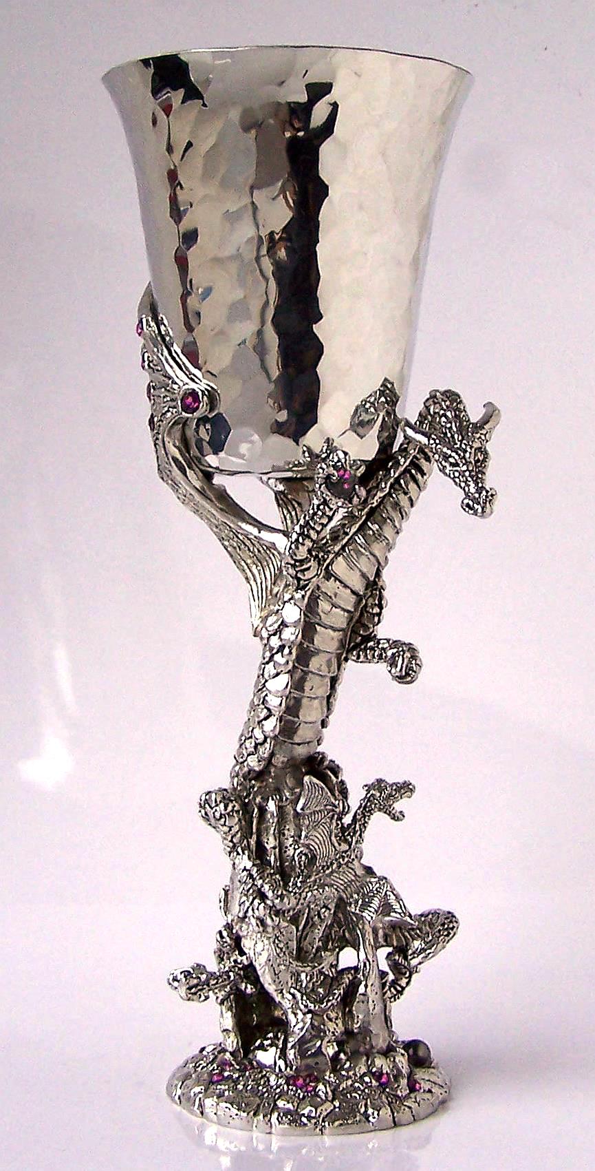 Three baby dragons have crawled out of the nest (so far), as their Mother watches over them. One is about to bite her tail! She holds a crystal in one paw, her wings are encrusted with crystals, and they're scattered all around the nest. We make this Limited Edition Goblet by hand from lead-free pewter. It holds 10 oz.